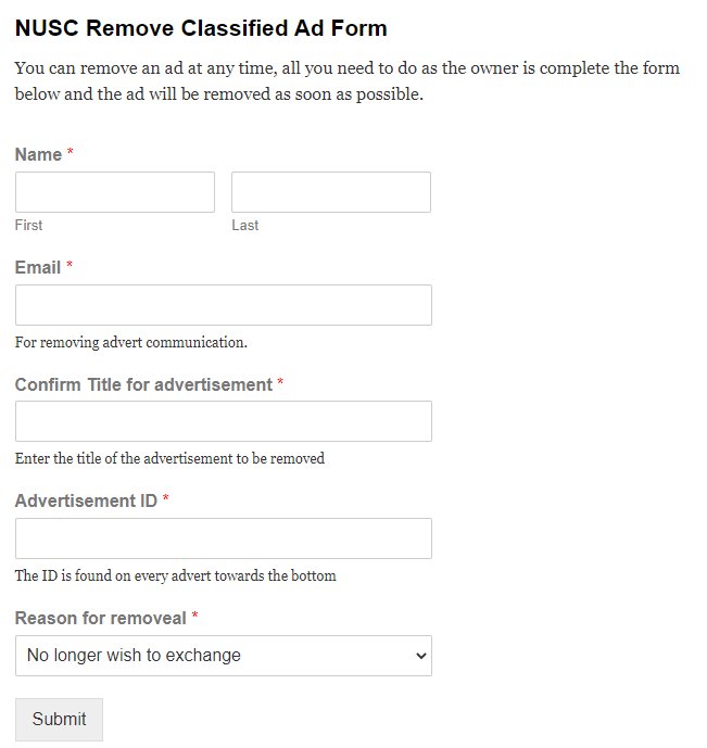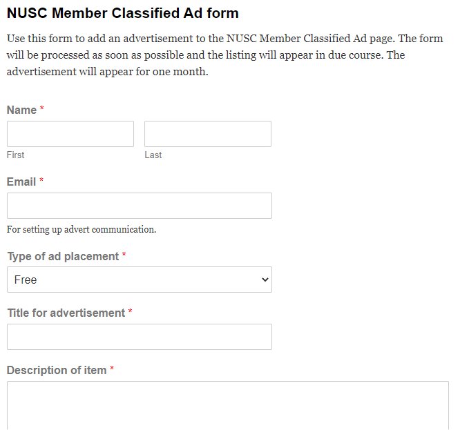 The NUSC only provides the opportunity to list items, it takes no monies in exchange for the transaction, it does not validate the ownership or condition of the goods, and is not responsible any part of the exchange. In the event of dispute this will be the members expense and not an issue for the NUSC to resolve. Please remember Caveat emptor – “Let the buyer beware”.