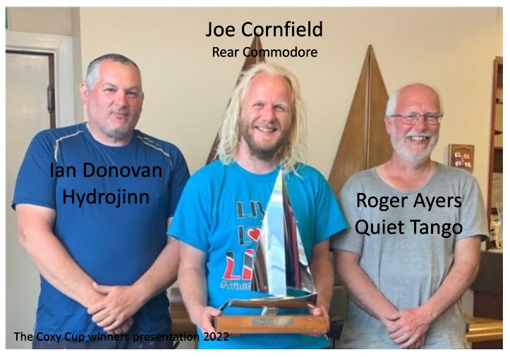 After a long day of sailing the course from, Cardiff to Newport, three boats made it to the finishing line. Unfortunately, despite being a beautiful sunny day there was a lack of wind and all the boat struggled to make way. At the finishing line, Havoc from Cardiff sailing club crossed first, with Quiet Tango and Roger Ayres second, followed by Hydrojinn with Ian Donovan in third place. No other boats crossed the line. At the presentation, Newport Uskmouth Sailing club were declared the winners and retainers of the Coxy cup by Joe Cornfield (Rear Commodore).